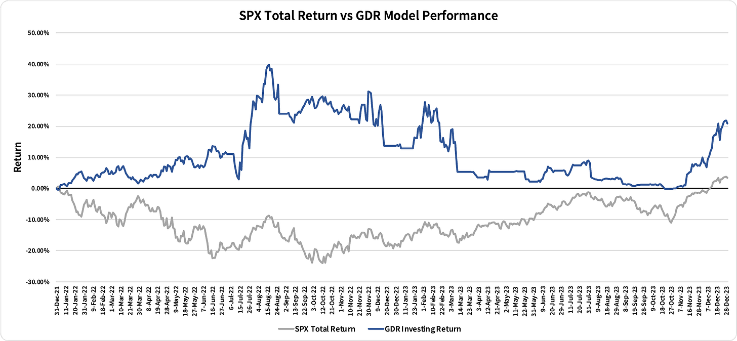 The GDR Model took 6 years to create and has now been running for a full 2 years. Despite the poor performance in 2023, this year turned out to be extremely productive as it exposed critical flaws in the model that I believe I was able to effectively address and fix.