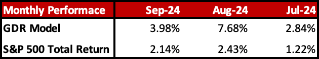 For July and September, the GDR Model beat the S&P 500, but somewhat narrowly: