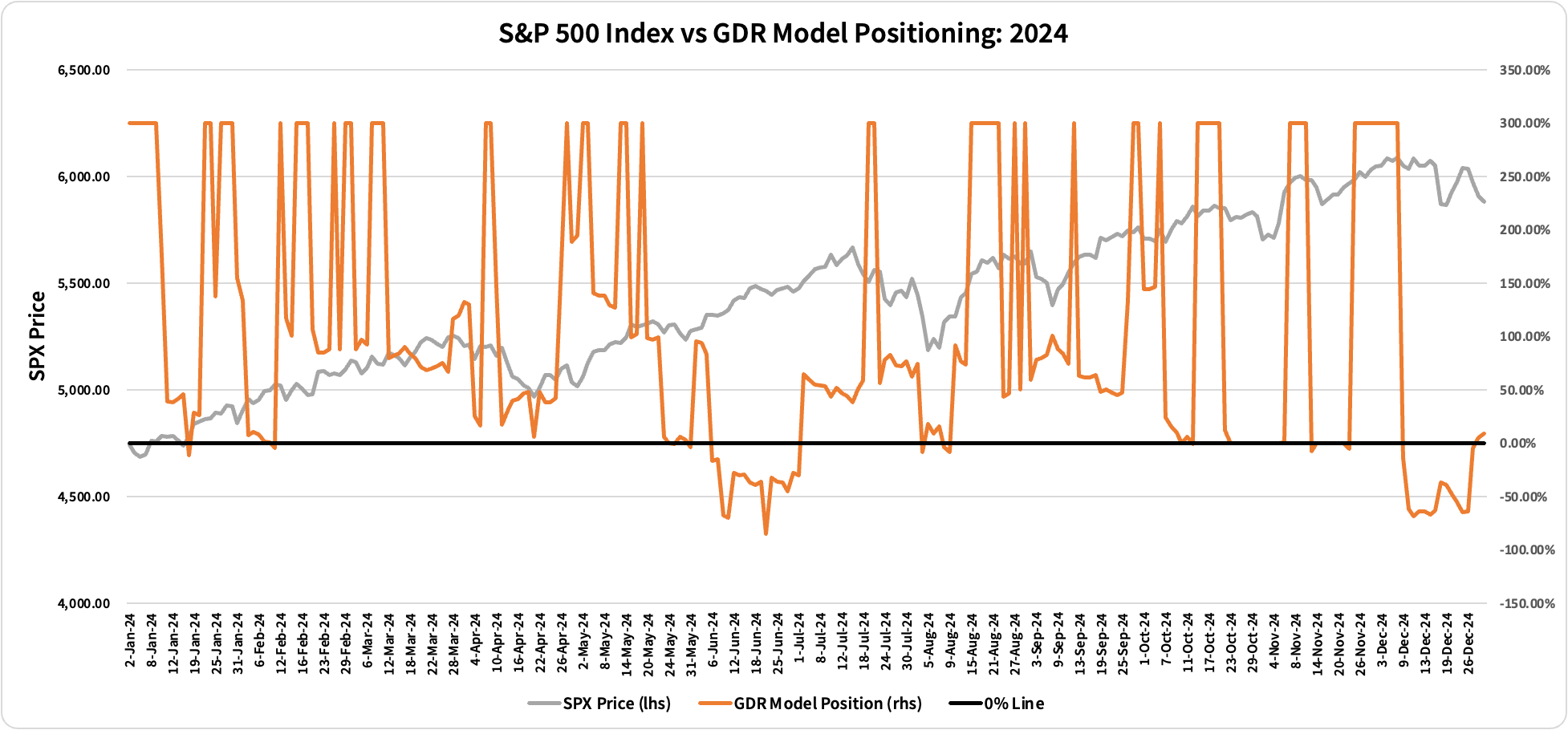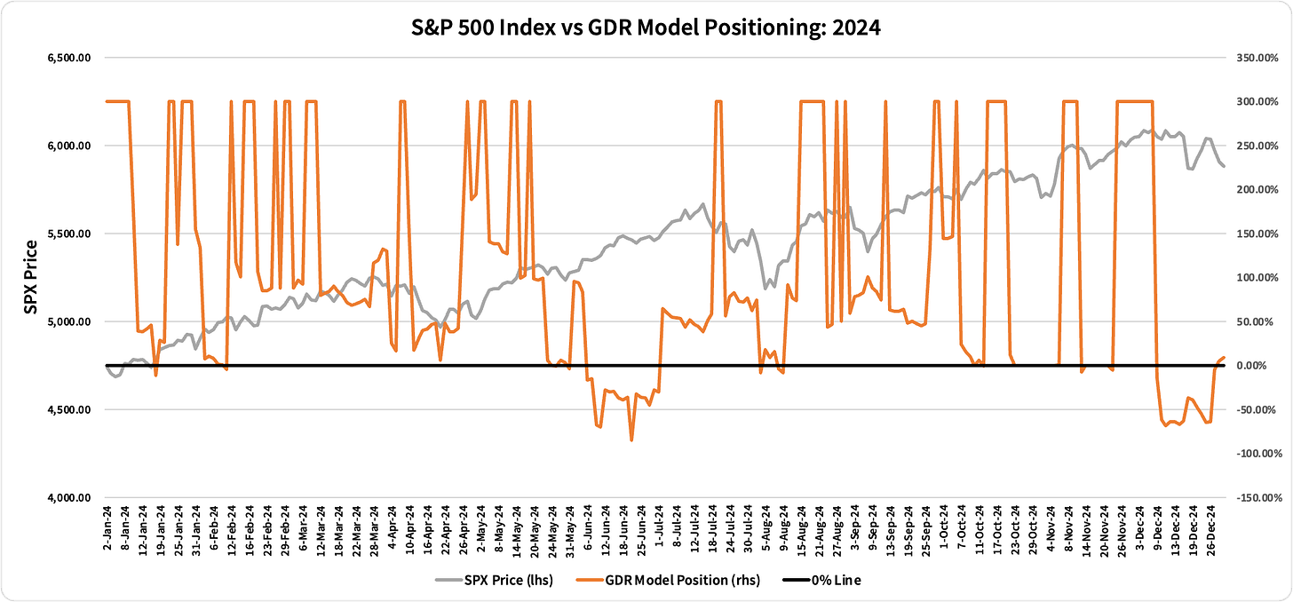 Within trading and investing circles you often hear people say something along the lines of “no strategy works all of the time. The best you can do is to have a strategy that works some of the time, and when it works that the profit it generates is greater than its losses when it doesn’t work.” Q2 is a great example of a time period for which the GDR Model’s style is weak. You can see it clearly in this chart of the S&P 500’s price vs the model’s positioning over 2024: