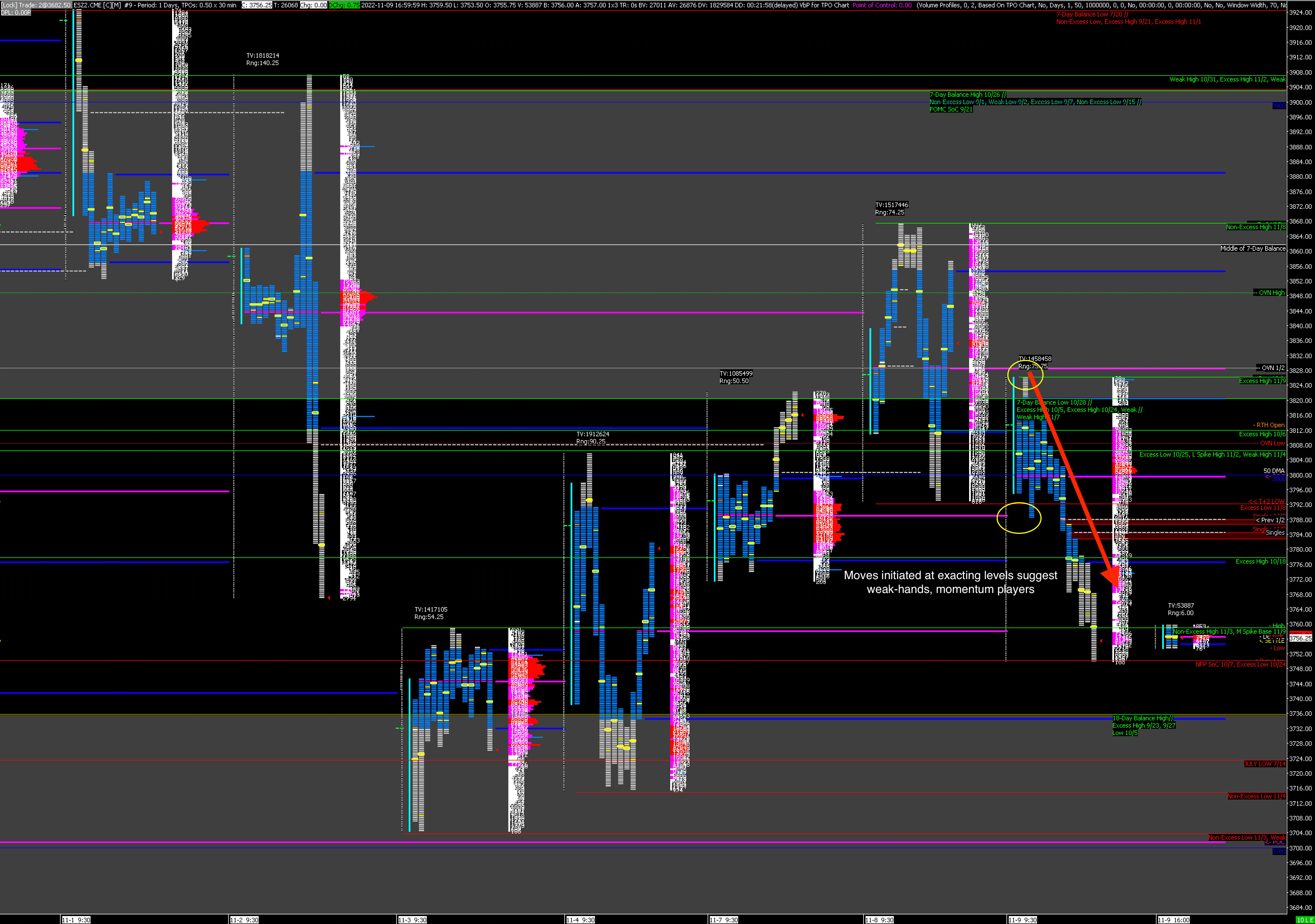 As expected, and as typical on days before major releases, today’s trade in the ES was dominated by weak-hands momentum players. The key to identifying this is to look for exacting levels. For instance, the move down from the day’s high set mid-morning started from just below yesterday’s POC and overnight halfback. Another example: for each 30-minute period for most of the day, the highs were set without violating the trend line marked by the red arrow in the chart above. This suggests momentum traders were waiting for that exact reference point to begin selling.