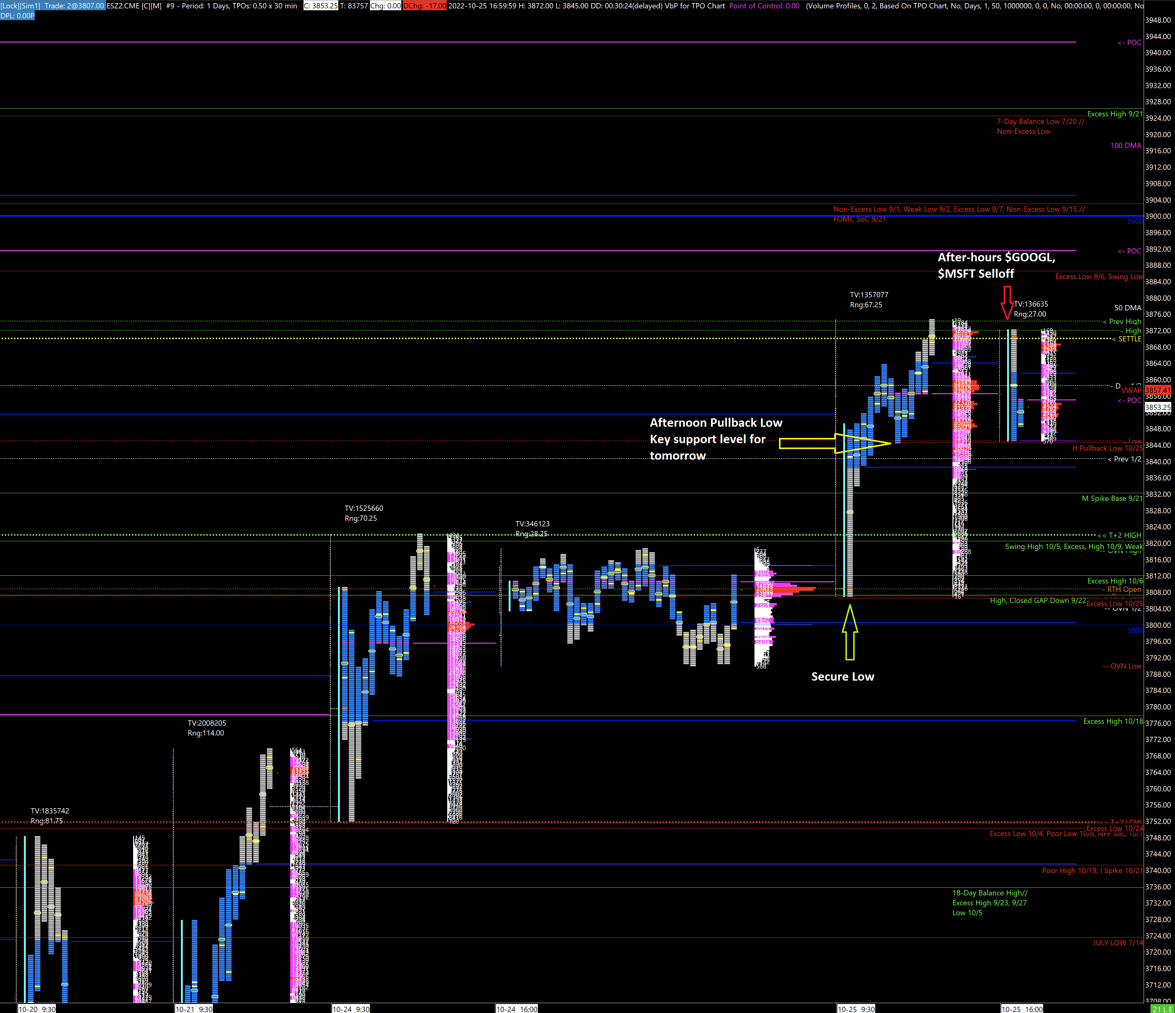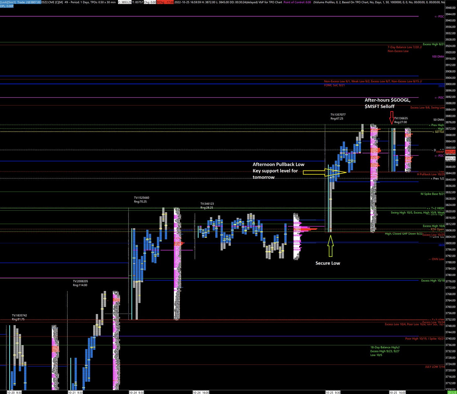 In yesterday’s update, I wrote “As of now, there are better odds that ES futures continue going up in the near-term." When the market was up nearly 70 points at the day’s high, I tweeted caution in carrying long positions overnight due to MSFT 0.00%↑ and GOOGL 0.00%↑ earnings. The announcements caused ES futures to give up 20 points.