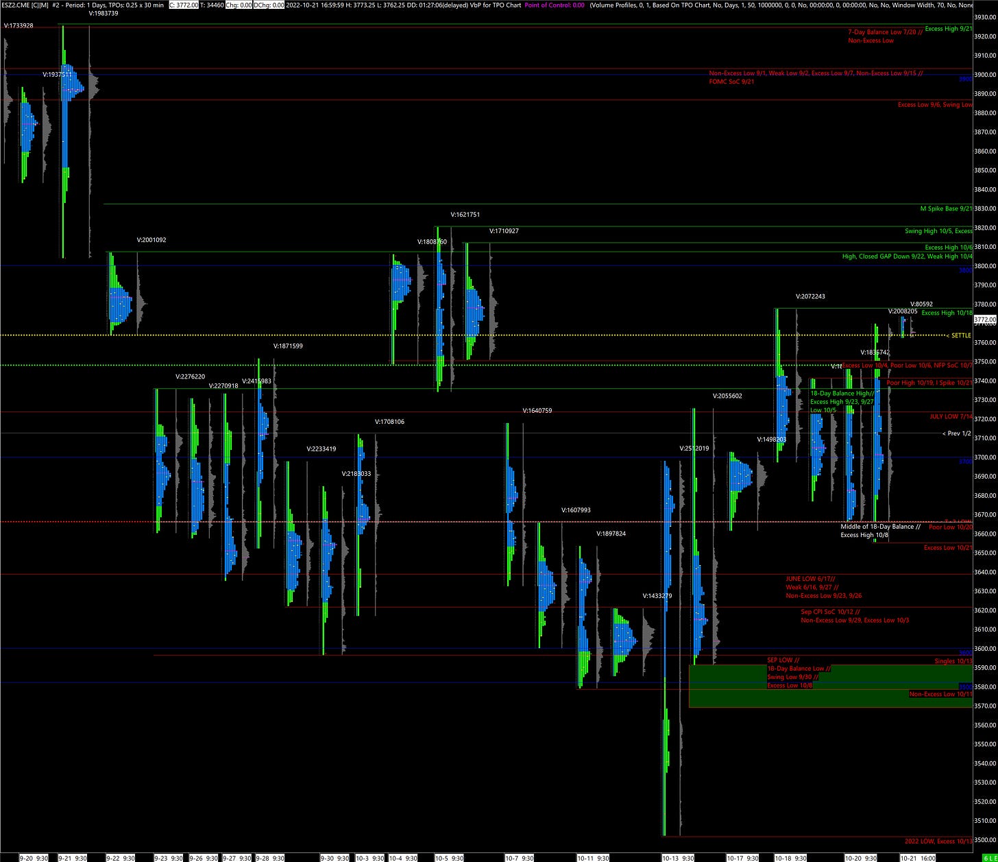 While last Friday’s low seems secure, the day ended with a low conviction spike up. The key to watch for tomorrow is whether Friday’s afternoon spike is rejected (market trades below 3741) or accepted (stays above 3741, preferably with continuation). In addition, bear in mind that this is also the latest of many attempts to break out of what is now an 18-day balance/consolidation zone.