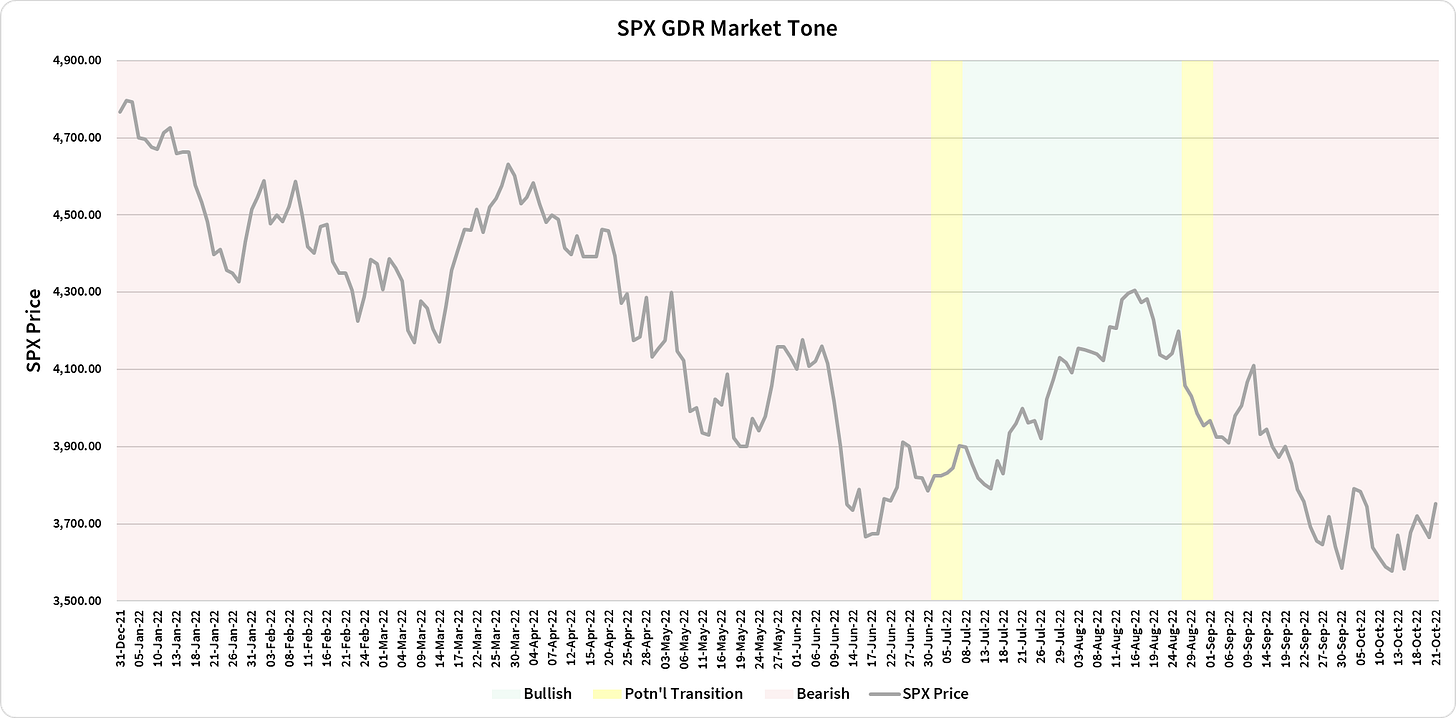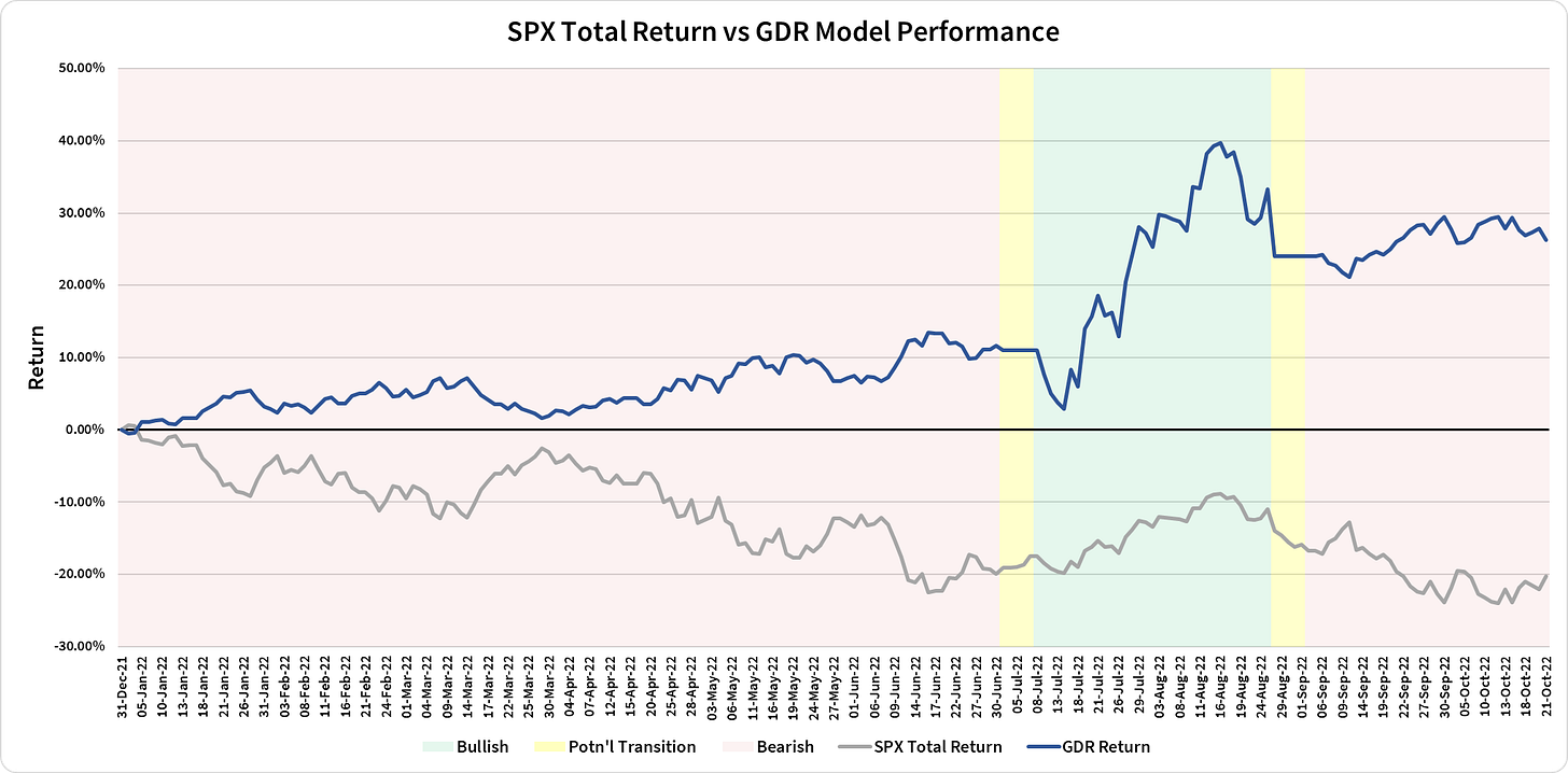 Commentary: despite the strong rise in the S&P 500, the GDR Model remains firmly bearish as it is more focused on catching longer-lasting moves in the index. Moreover, the strong move last Friday appears to be more in line with short-covering precipitated by monthly options expiration.