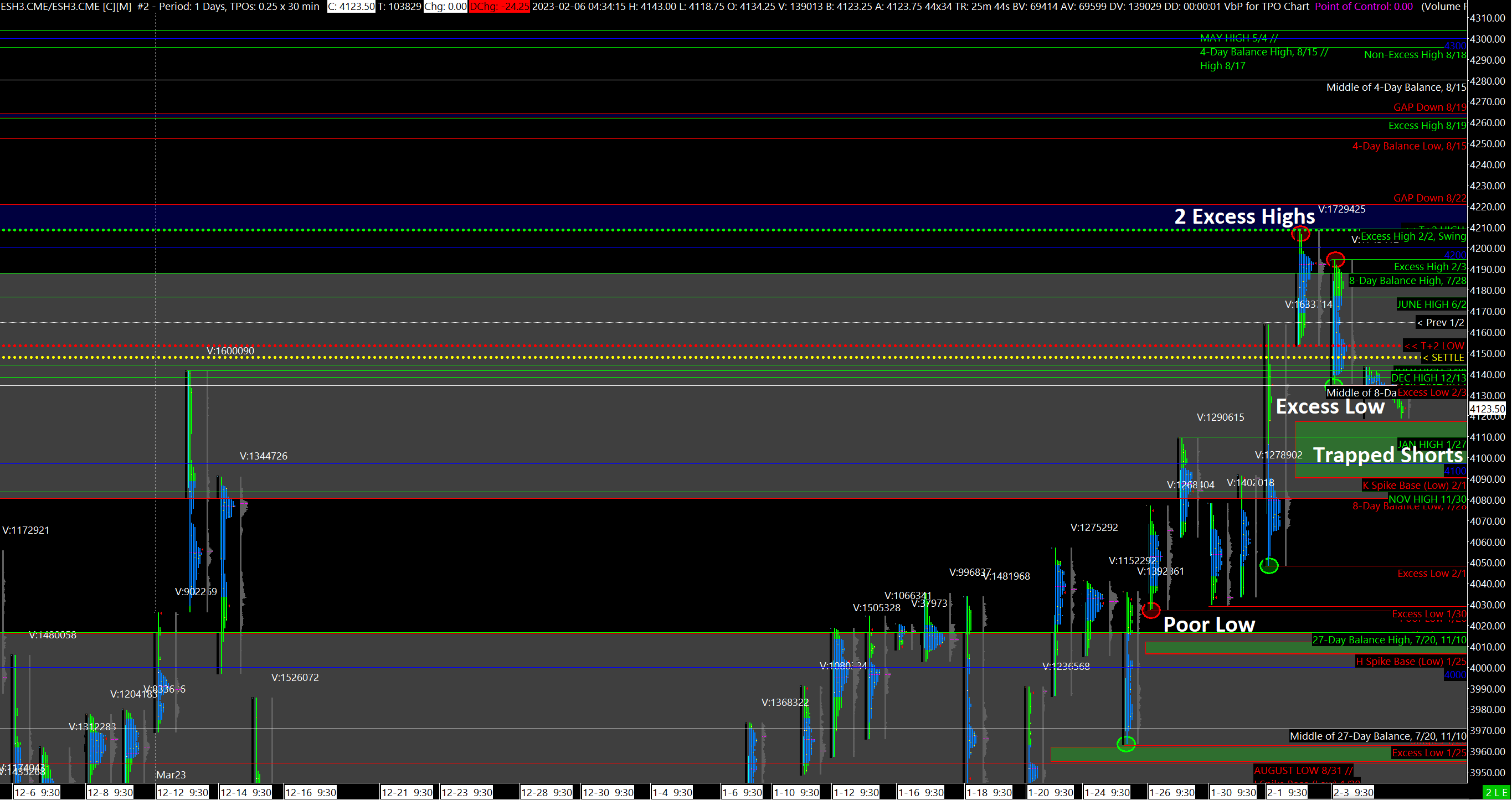 While it’s entirely reasonable for the ES to correct the Poor Structure from Fed Day last Wednesday, it is critical that we carry in our minds the Poor Low from 1/26 that sits all the way down at 4026. I’m not suggesting you should expect the ES to reach that low, but do keep it in mind as a real possibility.