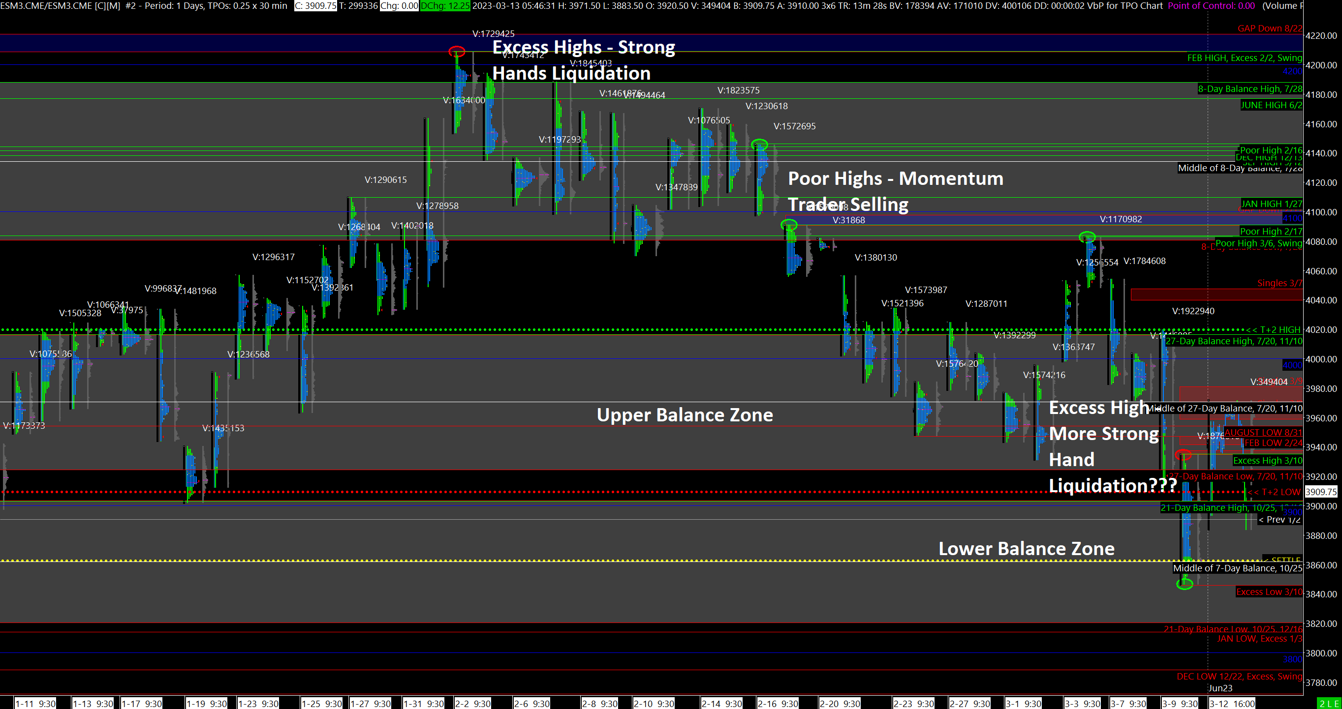 Last night, the market opened to a violent short-covering rally, but most of that has already been given back by the market (remember, short-covering often weakens a market). Currently the ES is in no man’s land, in between 2 major Balance Zones - whichever one is accepted will likely guide where the market will go next: