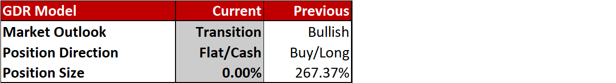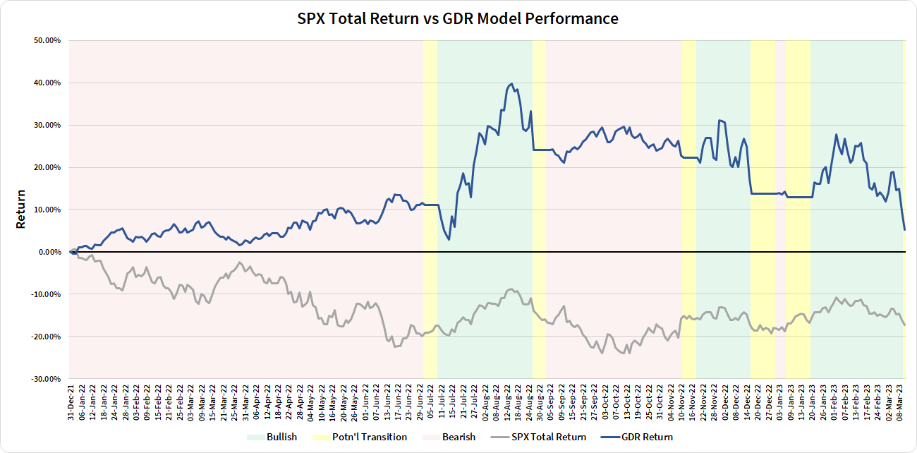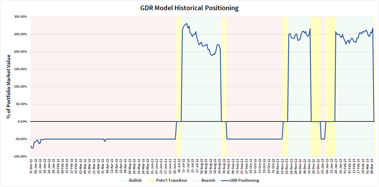 Commentary: news of the SVB collapse (parent: SIVB 0.00%↑) led to a broad-based sell-off in equity markets and GDR Model is now, unsurprisingly, fully in cash. Either the market shurgs this off relatively quickly and traders buy the dip or this could be a sign of something brewing this year… Either way, this is the kind of occurrences that GDR Model has a tough time guarding against. It’s a good thing they don’t happen all too often…