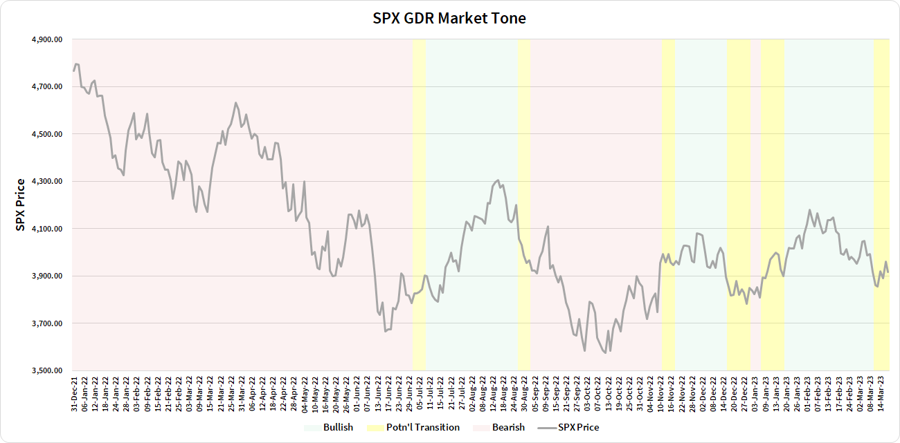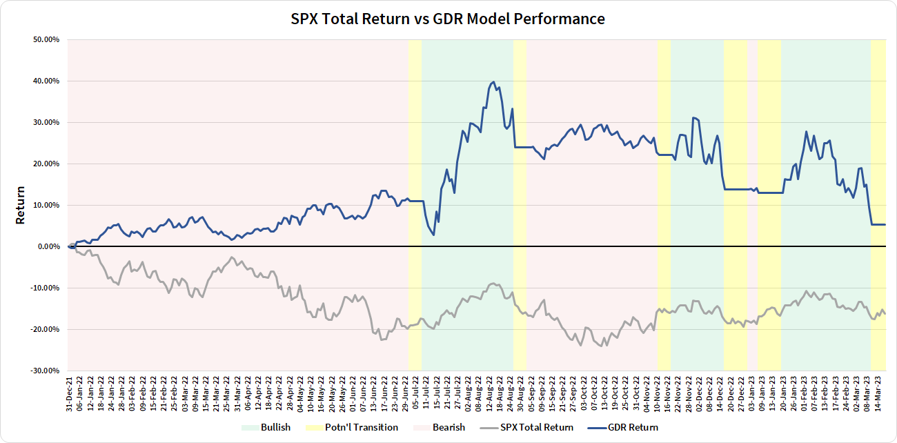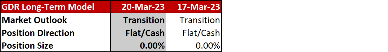 Commentary: GDR Model has remained steadily Bearish. This week will be key as the market looks to see how the FOMC will react to the recent struggles in the Financial Sector