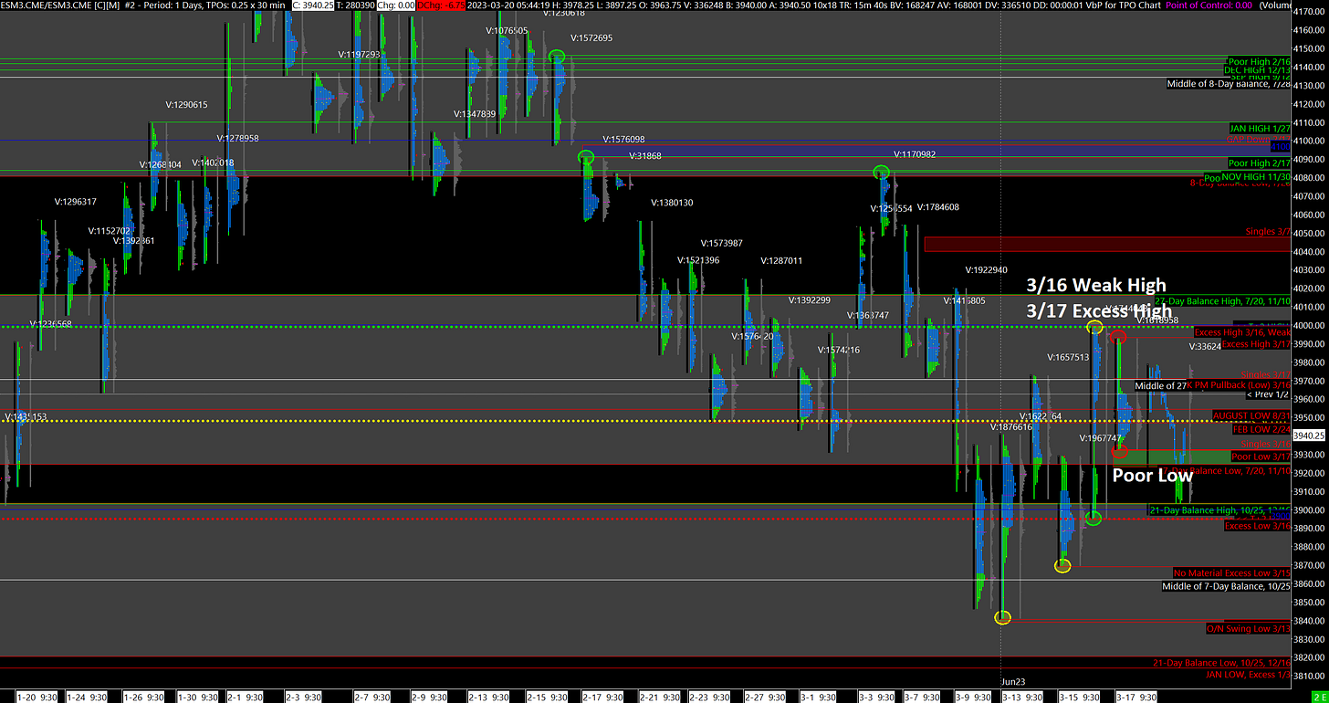 Friday’s counterpoint highlighted the potential for liquidation given that Thursday’s rally looked led by short-covering. The market left behind a Poor Low following Friday’s Liquidation, which increases the odds that it will be taken out. Moreover, today’s Overnight session has been unusually volatile with a wide range. This suggests the market is still trying to make sense of the SVB (parent SIVB 0.00%↑) and Credit Suisse (CS 0.00%↑) collapses and the potential impact these may have on this week's Fed Interest Rates Decision.