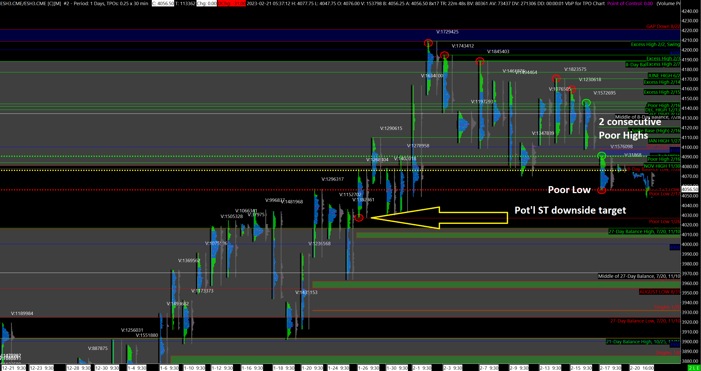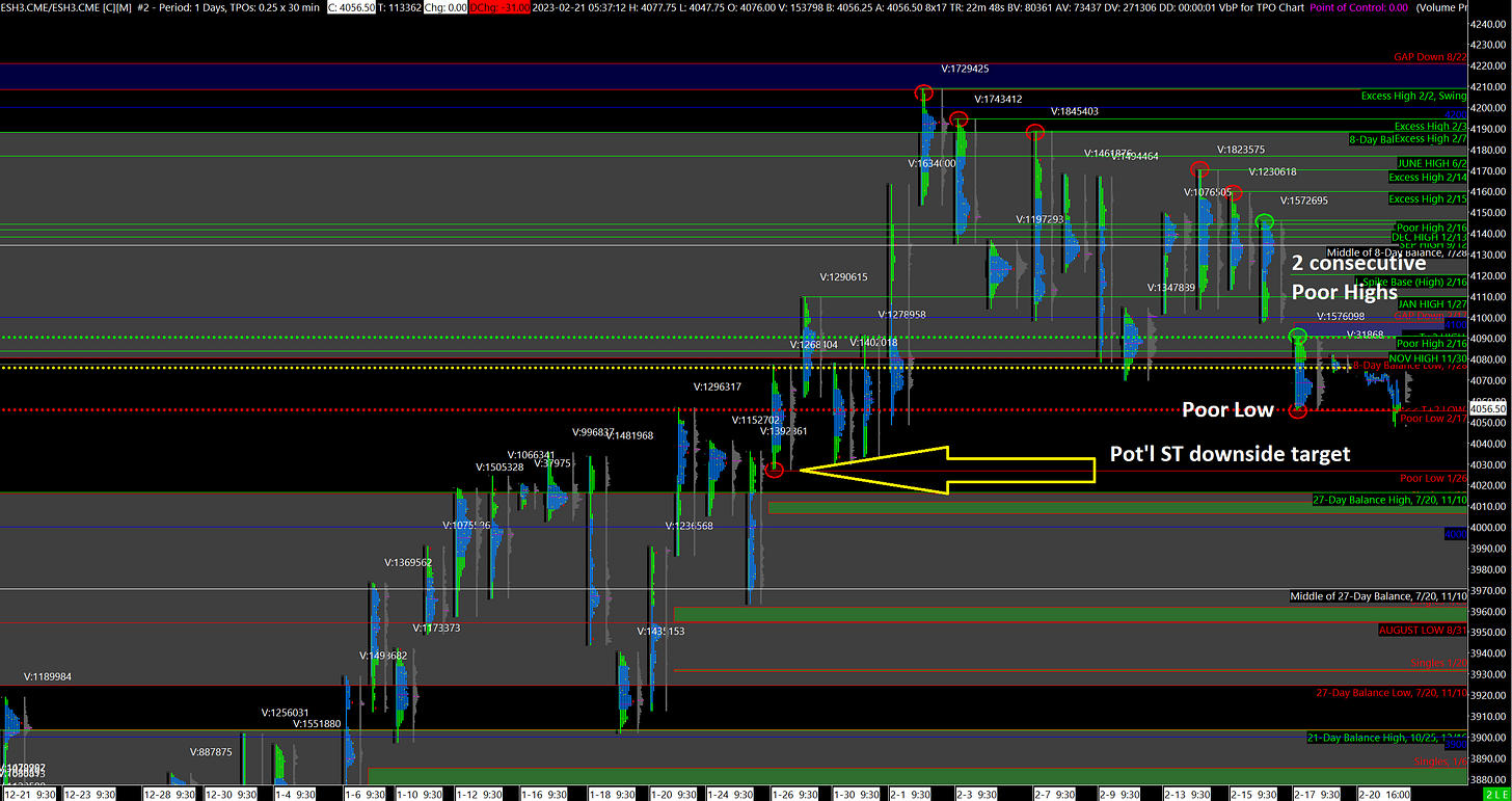 In addition, there seems to be a clear target below: the Poor Low from 1/26 that sits around 4027. If weak-hands traders keep piling on short and take out that downside target without the ES heading higher first, then the odds of further upside would increase materially.
