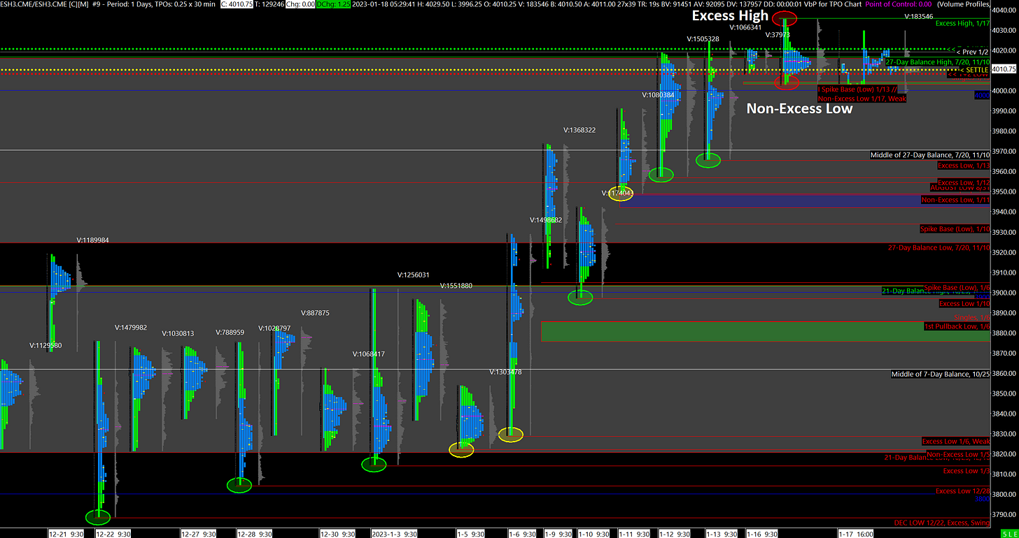 The market tried to break out of the current Balance Zone but couldn’t sustain a rally, leaving behind an Excess High. It then tried to break down lower twice but stopped short at the Friday Spike Base almost exactly. While it is not Poor, this Low lacks Material Excess and is Weak at it is on an exacting level.