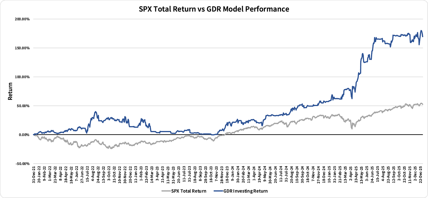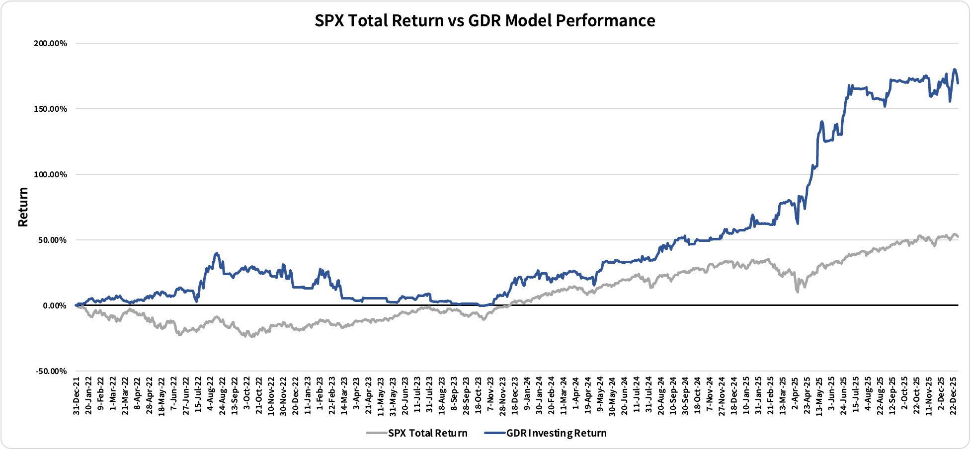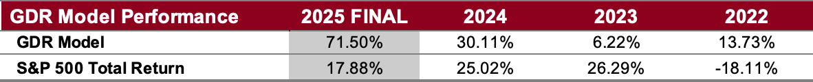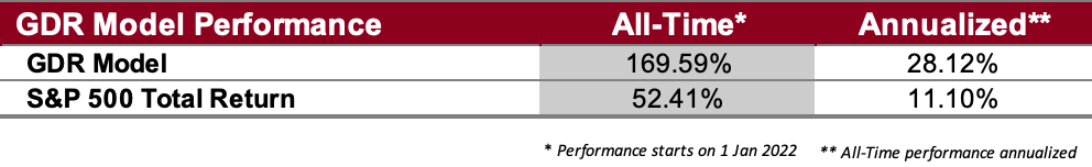 The following performance numbers for the GDR Model are hypothetical. They are produced with the assumption that the hypothetical portfolio invests only in the S&P 500 price index in the direction set by Position Direction and with the same level of exposure suggested by Position Size.