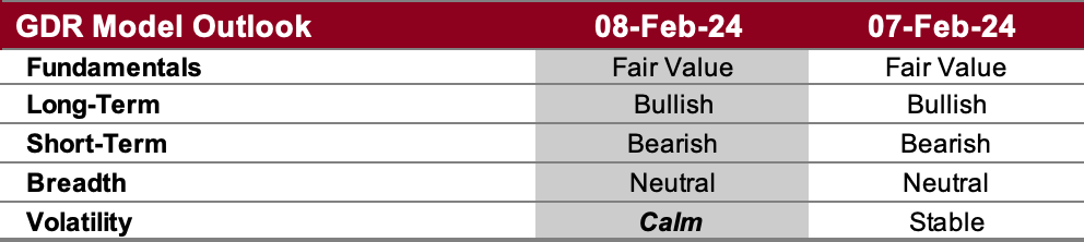 In line with the weakness the GDR Model picked up on recently, it has reduced its long position to roughly flat. Only if there is material strength will it re-enter a meaningful long position.