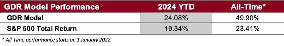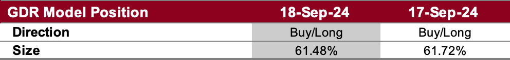 The GDR Model is carrying a reduced long position. Given the characteristics of the current market, the model is more likely to continue making meaningful tactical adjustments.