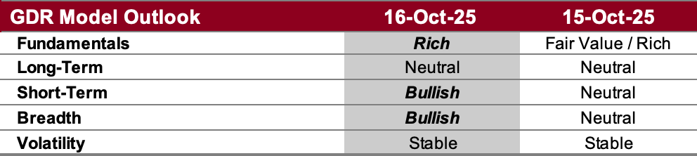 Overall Outlook (as of 15 Oct 2025): NEUTRAL TO BULLISH. The GDR Model has been pointing to an indecisive market, however recent strength suggests that there’s a possibility the recent indecision may be coming to an end.