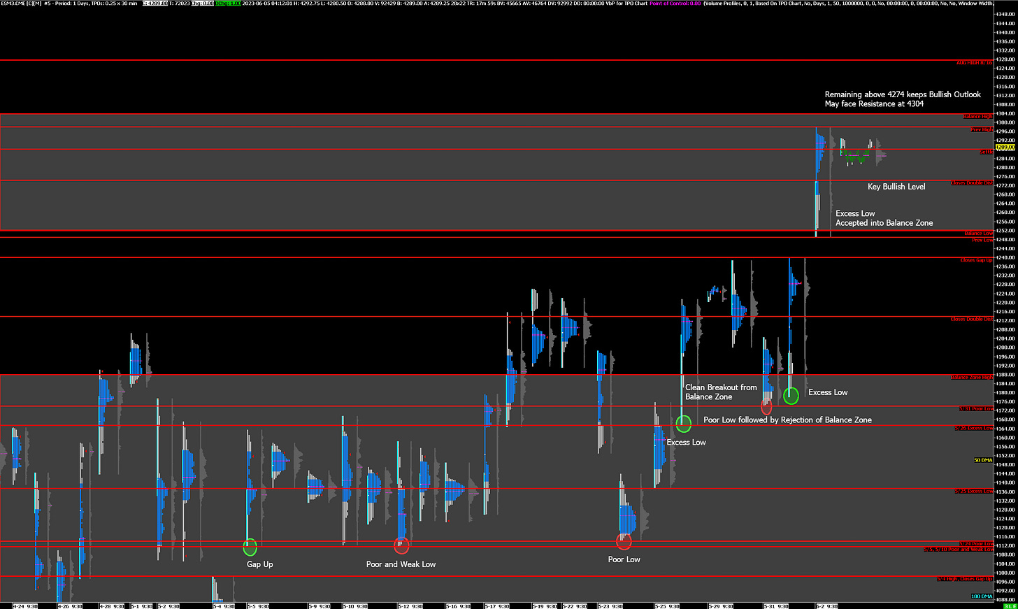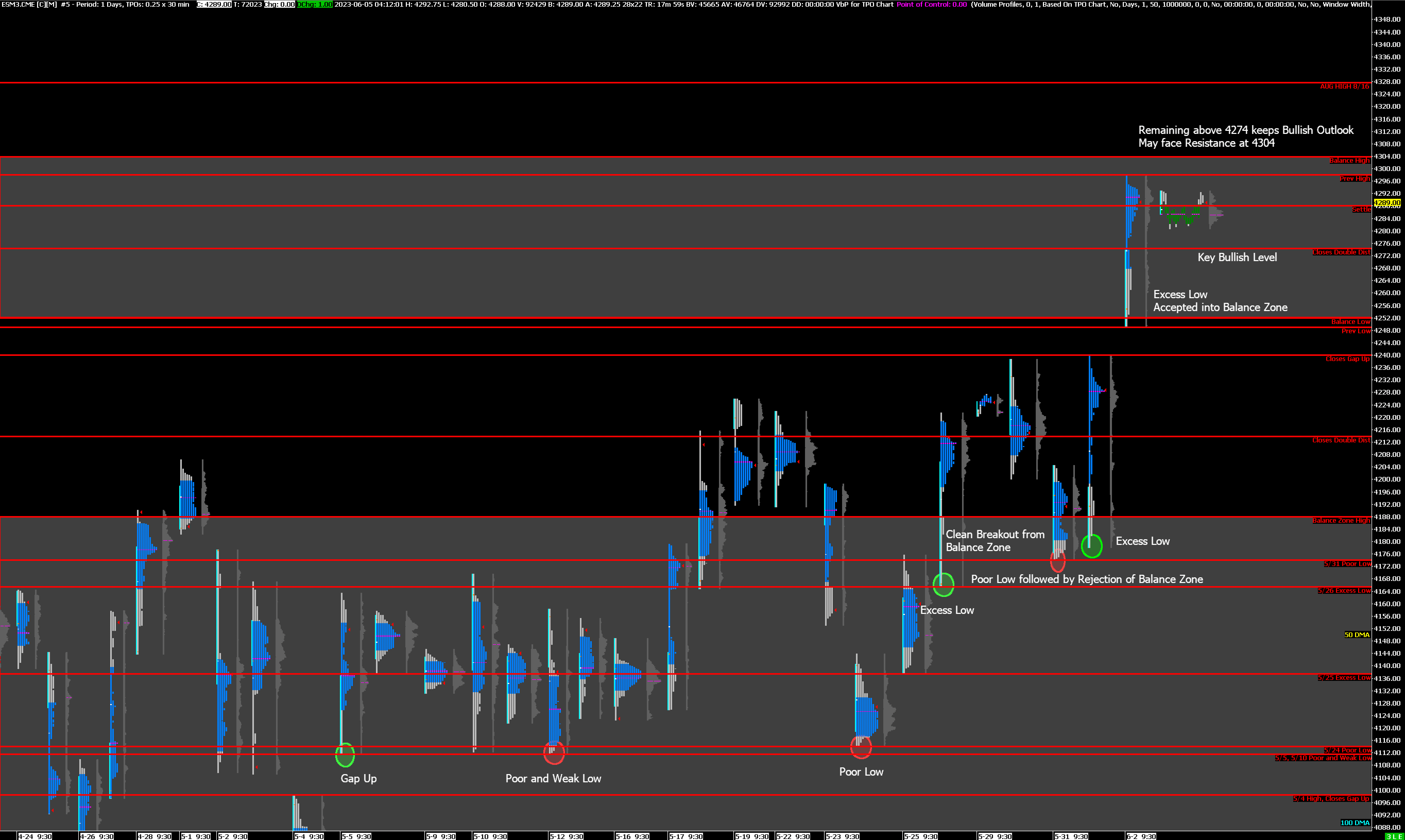 Bearish: 4274 (Closes Double Distribution), 4252 (Bottom of Current Balance Zone), 4240 (Closes Gap Up)