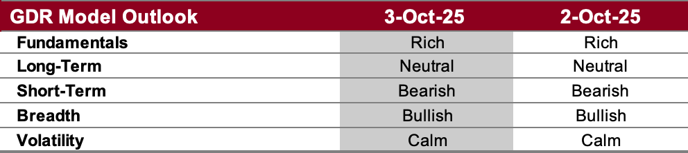 Overall Outlook (as of 2 Oct 2025): NEUTRAL. The weakness the GDR Model started to pick up on recently has continued for some time now. At this point, it’s looking like the market is going through a period of indecision.
