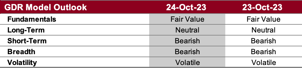 The GDR Model is flat after significant deterioration in the market. Sustained deterioration is likely to see the model open a short position.