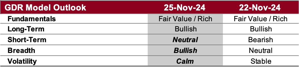 The GDR Model is flat due to the recent near-term weakness in the market. However, if recent strength is sustained, the model is likely to open a new long position.