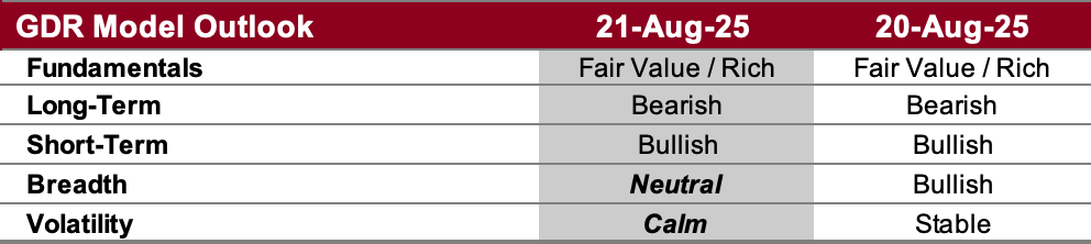 Overall Outlook (as of 20 Aug 2025): NEUTRAL. The GDR Model is picking up on plenty of indecision in the market despite the rally over the last few days. A sell-off may be off the table for now, but that can quickly change.