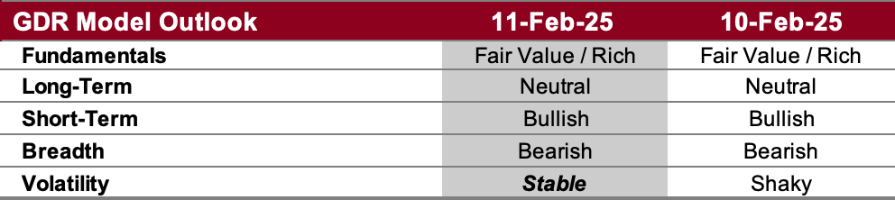 Volatility Outlook (as of 10 Feb 2025): volatility improved back to stable. If the market is able to maintain this or improve to calm then the probability of a meaningful sell-off decreases.