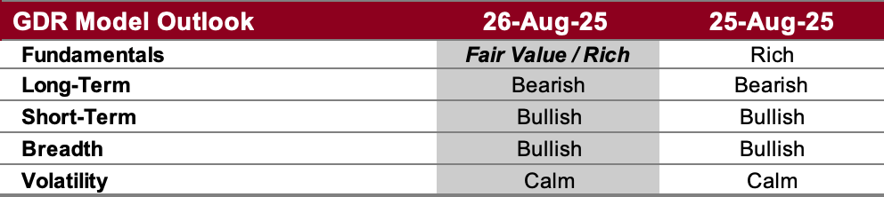 Long-Term Outlook (as of 22 Aug 2025): Bearish. The long-term outlook remains bearish but posted an unusually strong close to the week. The GDR Model is designed not to overreact, but the strength from Friday is sustained then a quick reversal in outlook could be in the cards… Time will tell.