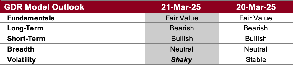 Volatility Outlook (as of 20 Mar 2025): the volatility outlook is downgraded back to shaky. The recent back and forth between shaky and stable highlights the current indecision in the market.