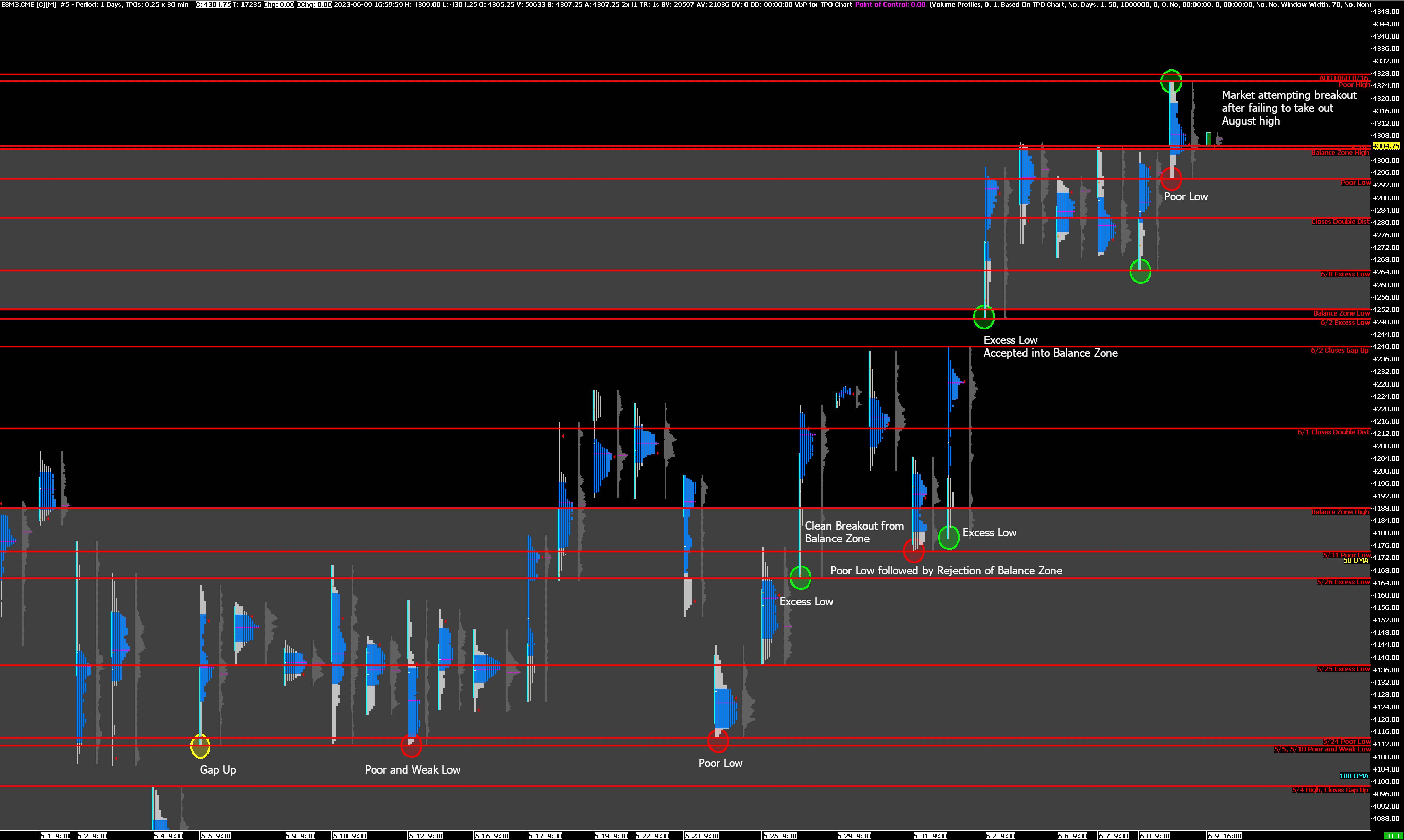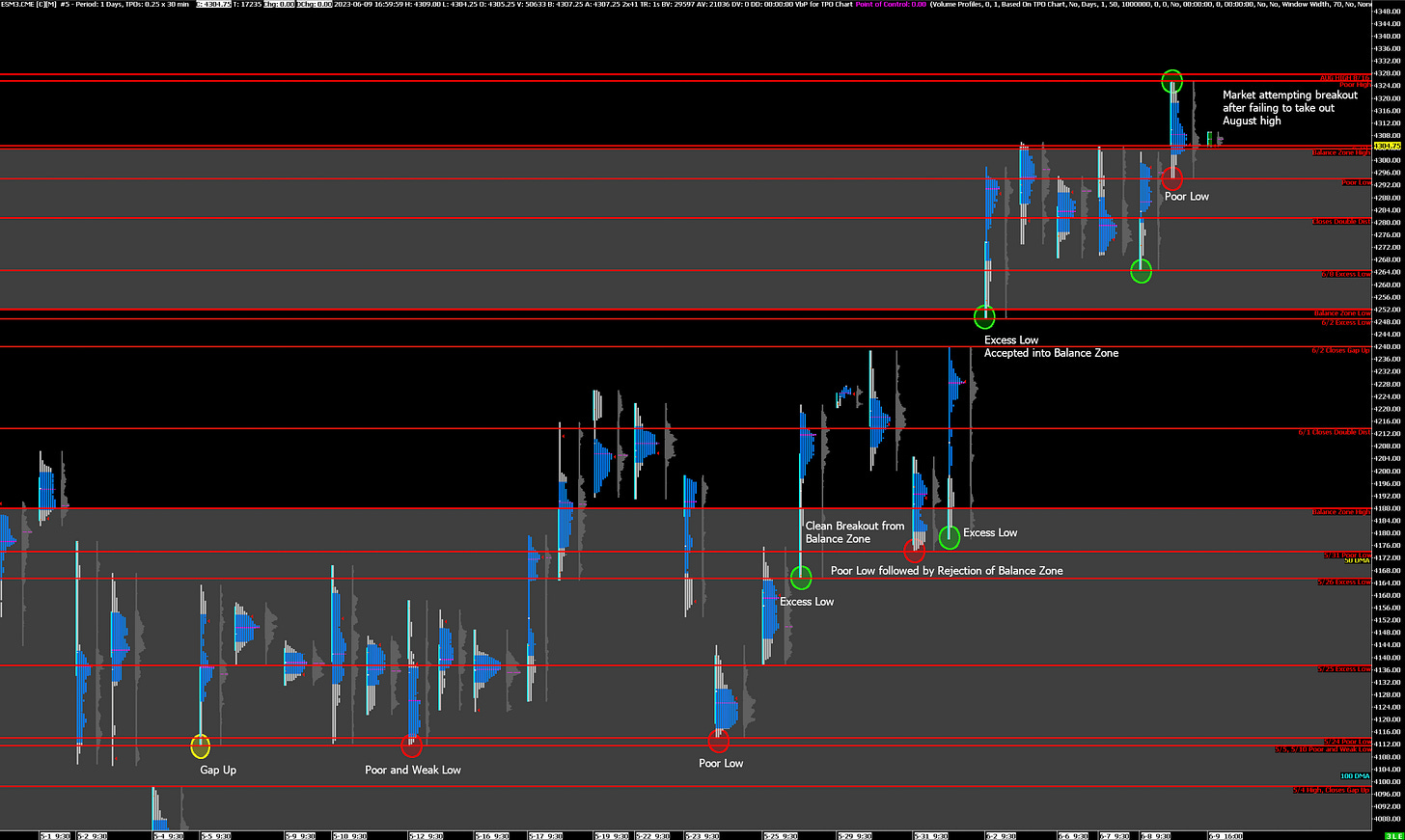 Bullish: 4326 (Friday Poor High), 4328 (August 2022 High), 4378 (Bottom of Upper Balance Zone)