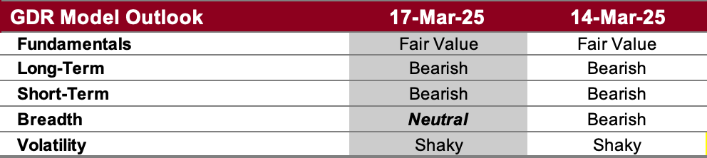 Breadth Outlook (as of 14 Mar 2025): breadth improved to neutral, but it’s borderline. For now it does not change the overall read of the model.