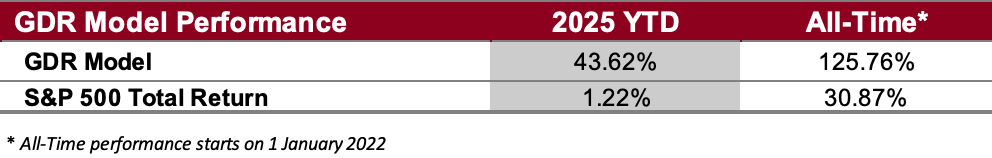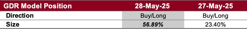 The GDR Model has boosted its long position modestly. This reflects the rising odds of another swing upward.