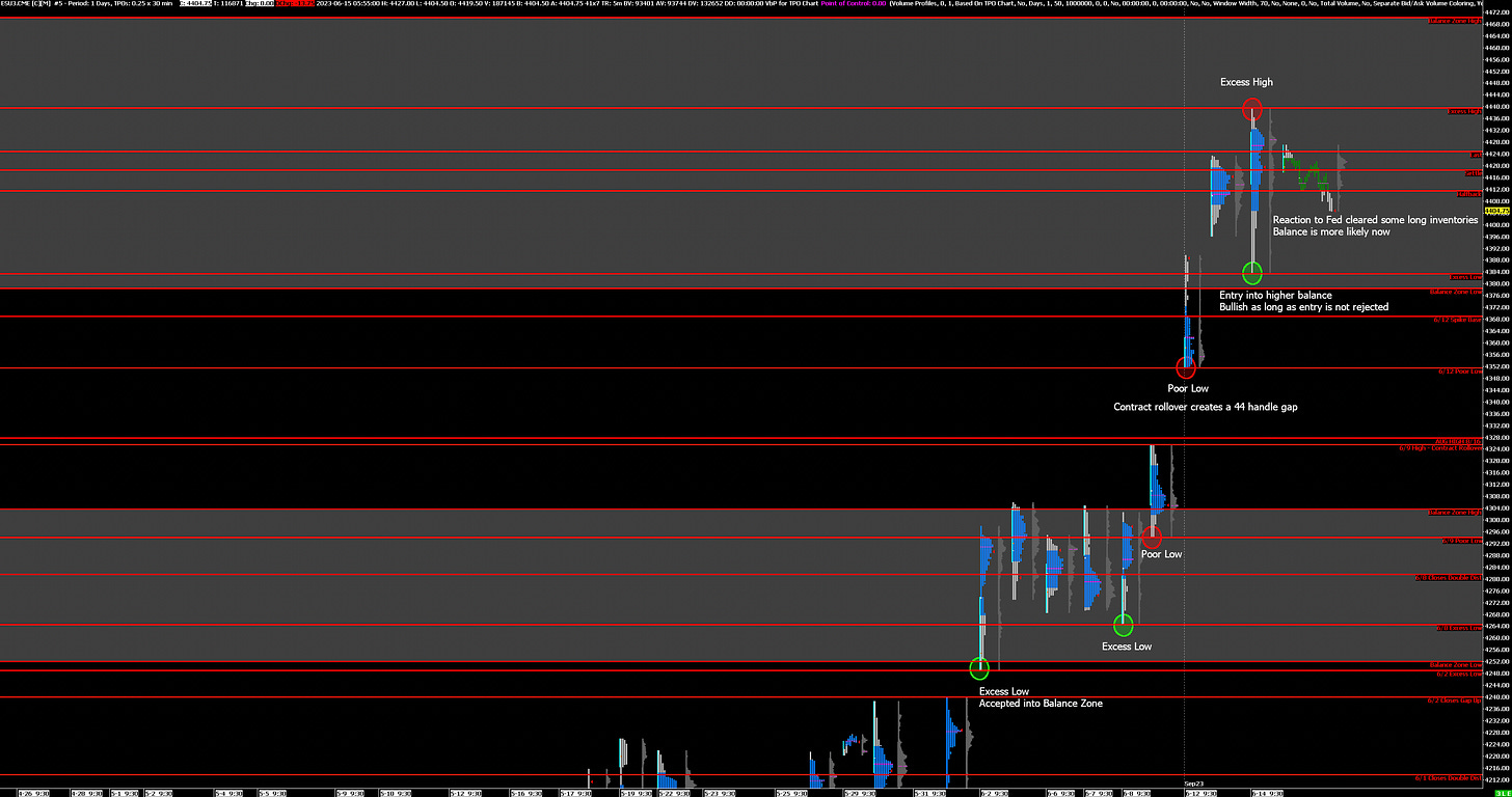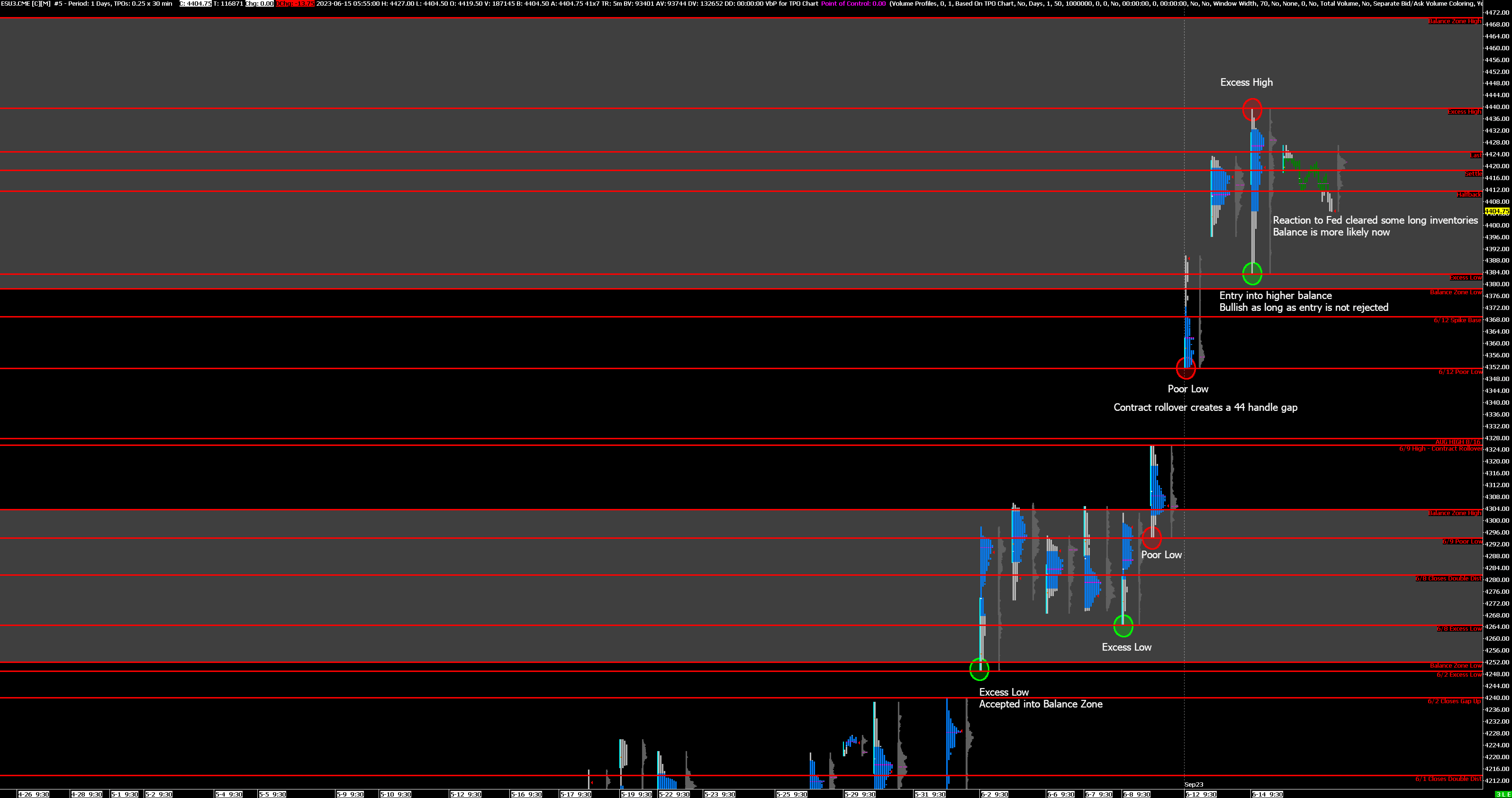 Yesterday the market used the reaction to the Fed’s interest rate announcement to rebalance some overly long inventories before recovering during the press conference. As a result the more likely scenario is that the market enters into a balancing period before making another directional move. You can apply balance trading guidelines today with edges at yesterday’s high and low.