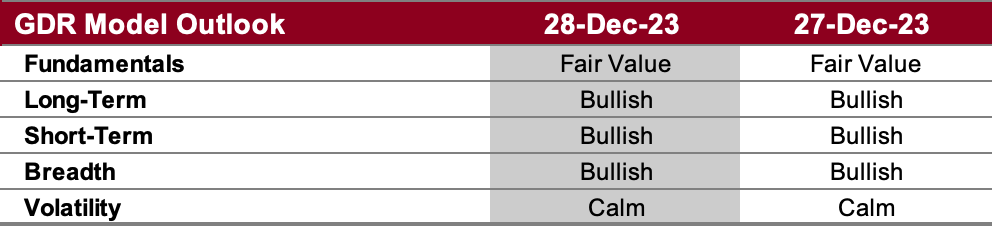 The GDR Model is bullish, but the Volatility Outlook has deteriorated slightly. This warrants caution in the near-term.