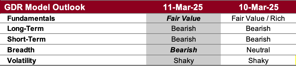 Breadth Outlook (as of 10 Mar 2025): breadth is back to bearish. This underpins the agreement between all of the model’s components that the market currently has a negative tone.