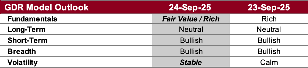 Overall Outlook (as of 23 Sep 2025): BULLISH TO NEUTRAL. After picking up on increasing strength over the recent days, the GDR Model has detected fresh weakness in the market to close the week. Either some sustained strength comes into the market to support it or the odds of the current rally continuing much further are likely low.