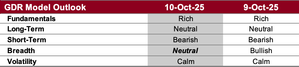 Overall Outlook (as of 9 Oct 2025): NEUTRAL. The weakness the GDR Model started to pick up on recently has continued for some time now. The strength seen towards the end of last week seems to have mostly vanished so the market is likely back to a state of indecision.