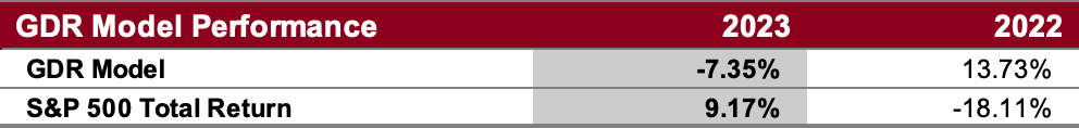 The GDR Model returned 1.82% in April vs the S&P 500’s 1.56%, modestly outperforming the index by 26 basis points. April was marred by possibly the most indecisive market in the last 3 years. Overall this year has been challenging for the Model’s style due to low confidence in the market.
