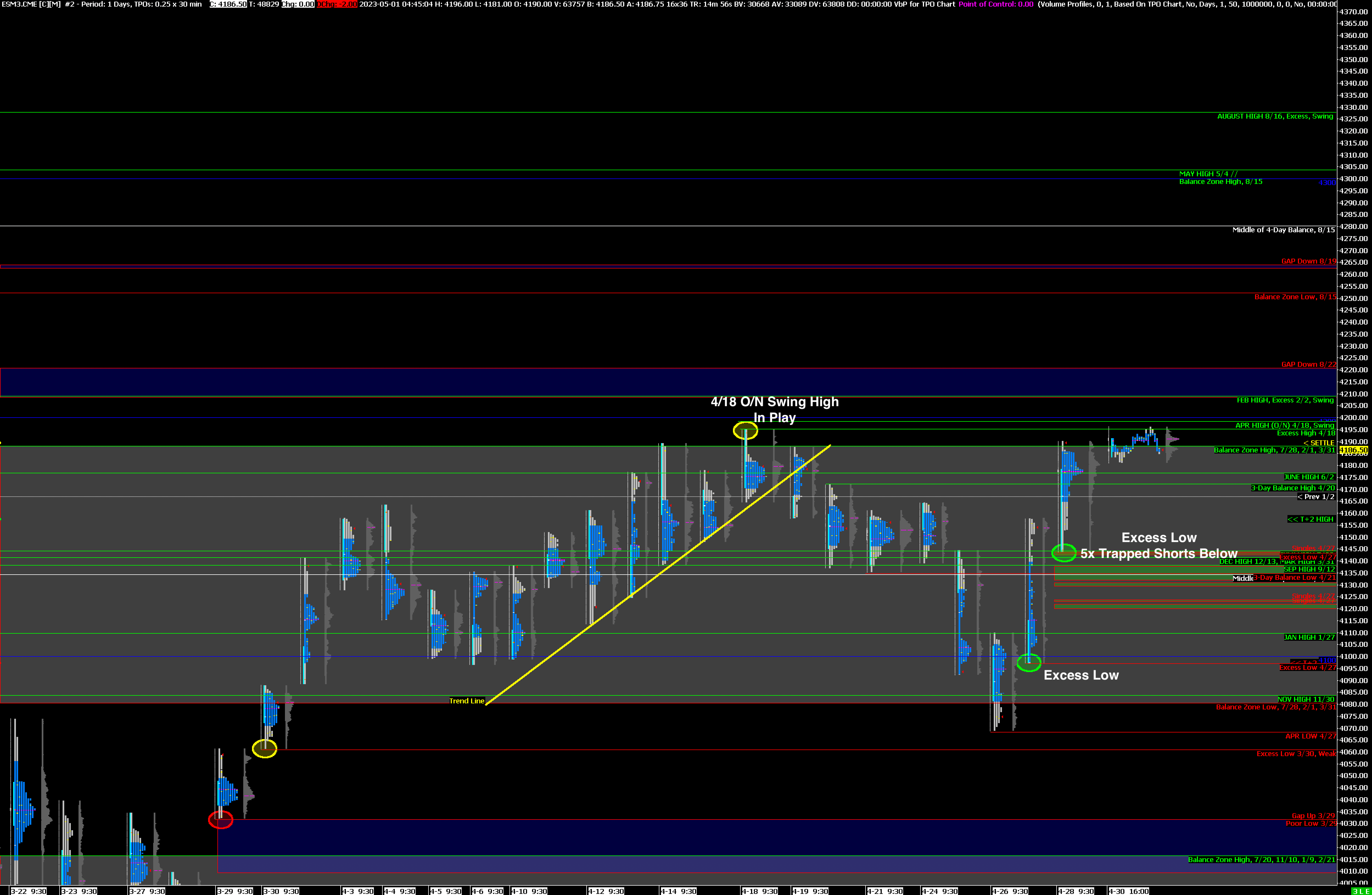 Friday morning continued Thursday’s Short-Covering Rally with almost no give back, so the Poor Structure from Thursday remains. The rally stopped at a logical spot, near the top of the current Balance Zone. This is now a key level: if the market trades and accepts above 4188 then there is a good chance of a breakout, starting with a challenge of the O/N Swing High from 18 April, which is also the High for the month.
