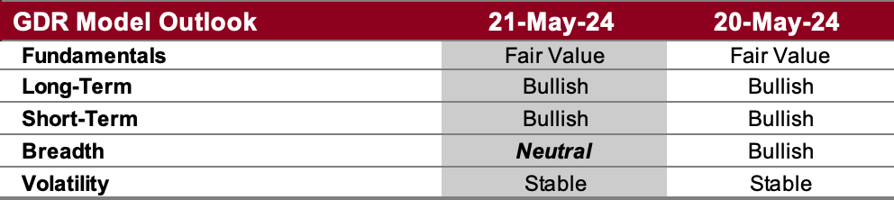 The GDR Model has a meaningful long position as the market has shown significant strength for a while.