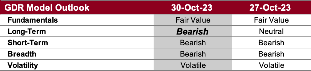 The market has deteriorated materially and the GDR Model is now bearish. The only exception is fundamentals, which suggest current S&P 500 index prices are fair.