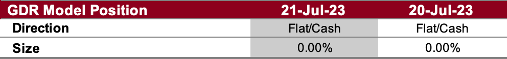 Even though the GDR Model remains bullish, it deteced more weakness than prices suggest towards the end of last week. In response, the model has pre-emptively closed its long position. If strength resumes, it would likely reopen the long position.