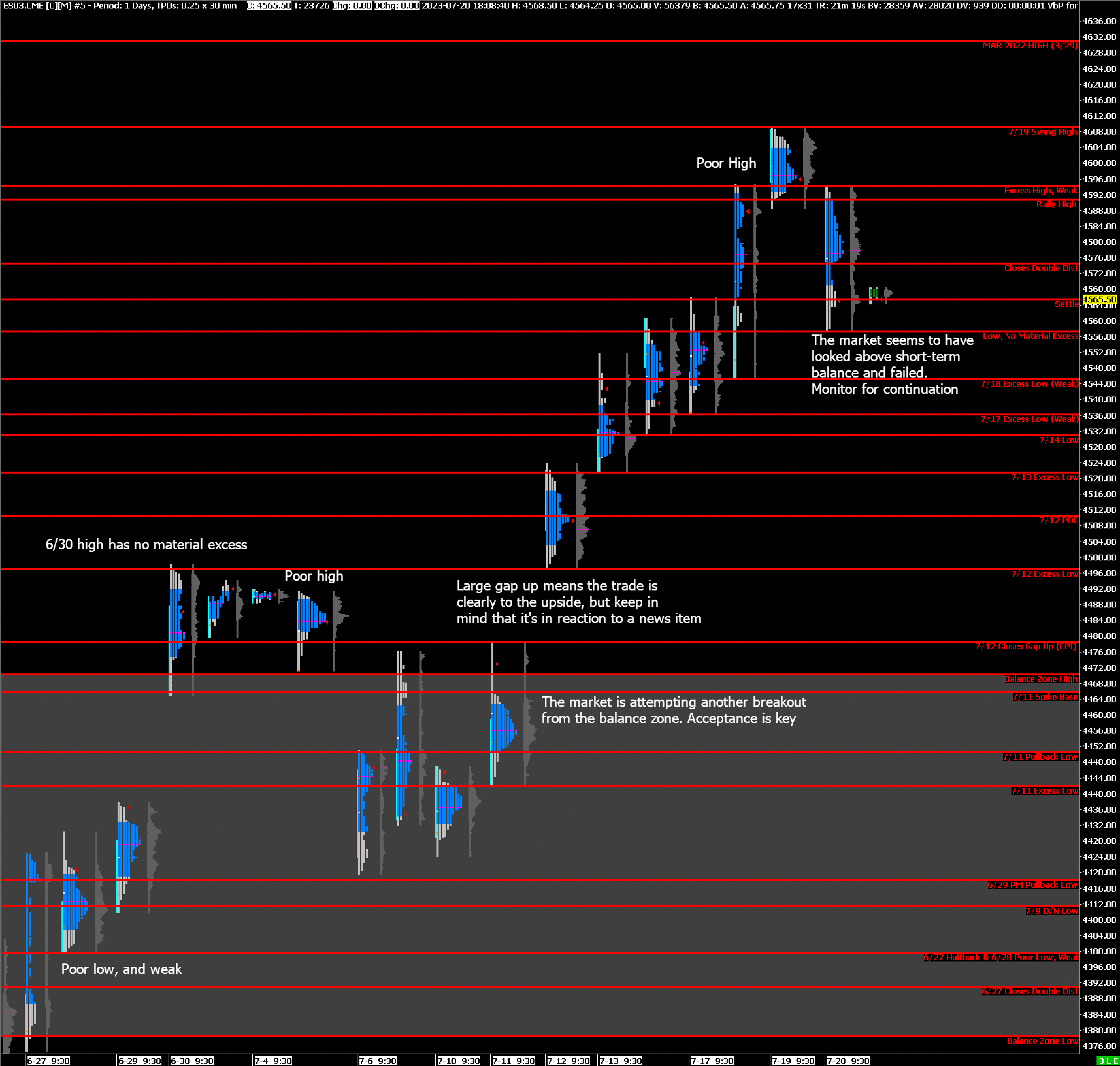 Bearish: 4557 (Y’day Low), 4566 (7/17 Excess High, Y’day Pullback Low), 4545 (7/18 Excess Low, Weak Low), 4536 (7/18 Excess Low, Weak Low)