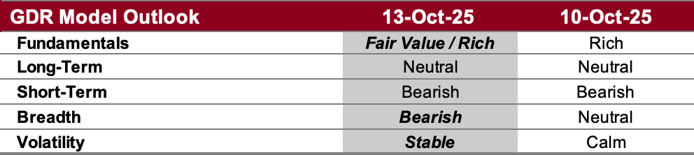 Overall Outlook (as of 10 Oct 2025): NEUTRAL. The weakness the GDR Model started to pick up on recently has continued for some time now. The strength seen towards the end of last week seems to have mostly vanished. There’s a fair chance that has been replaced with weakness… Time will tell.
