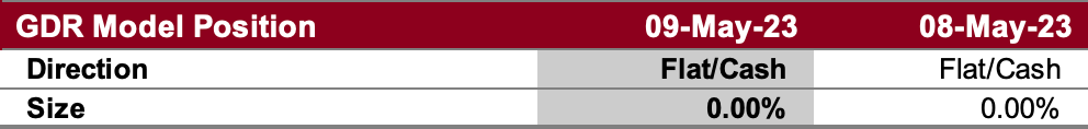 The model is still not committing to a position as there is not enough conviction. To say the market has been choppy would be an understatement, but the model is doing what it’s meant to do: stay out of the market when there is no clear established trend.