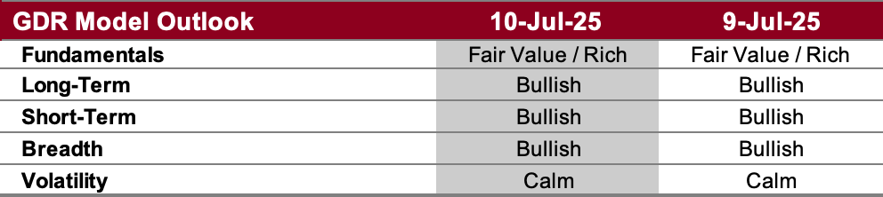 Fundamentals Outlook (as of 26 Jun 2025): Fair Value/Rich. The model has adjusted valuations slightly downward following the release of new data. Going forward GDR Model positioning should tactically tilt a little less towards the long side, all else equal. Note that this is just a barometer to help guide longer-term decision-making rather than short-term market timing.