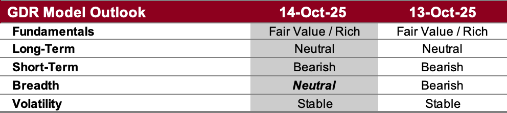 Breadth Outlook (as of 13 Oct 2025): Neutral. Breadth improved today. As a reminder, this data point is most useful when it’s aligned with the rest of the model’s components.