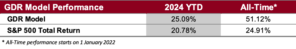 The GDR Model is carrying a reduced long position. Given the characteristics of the current market, the model is more likely to continue making meaningful tactical adjustments.