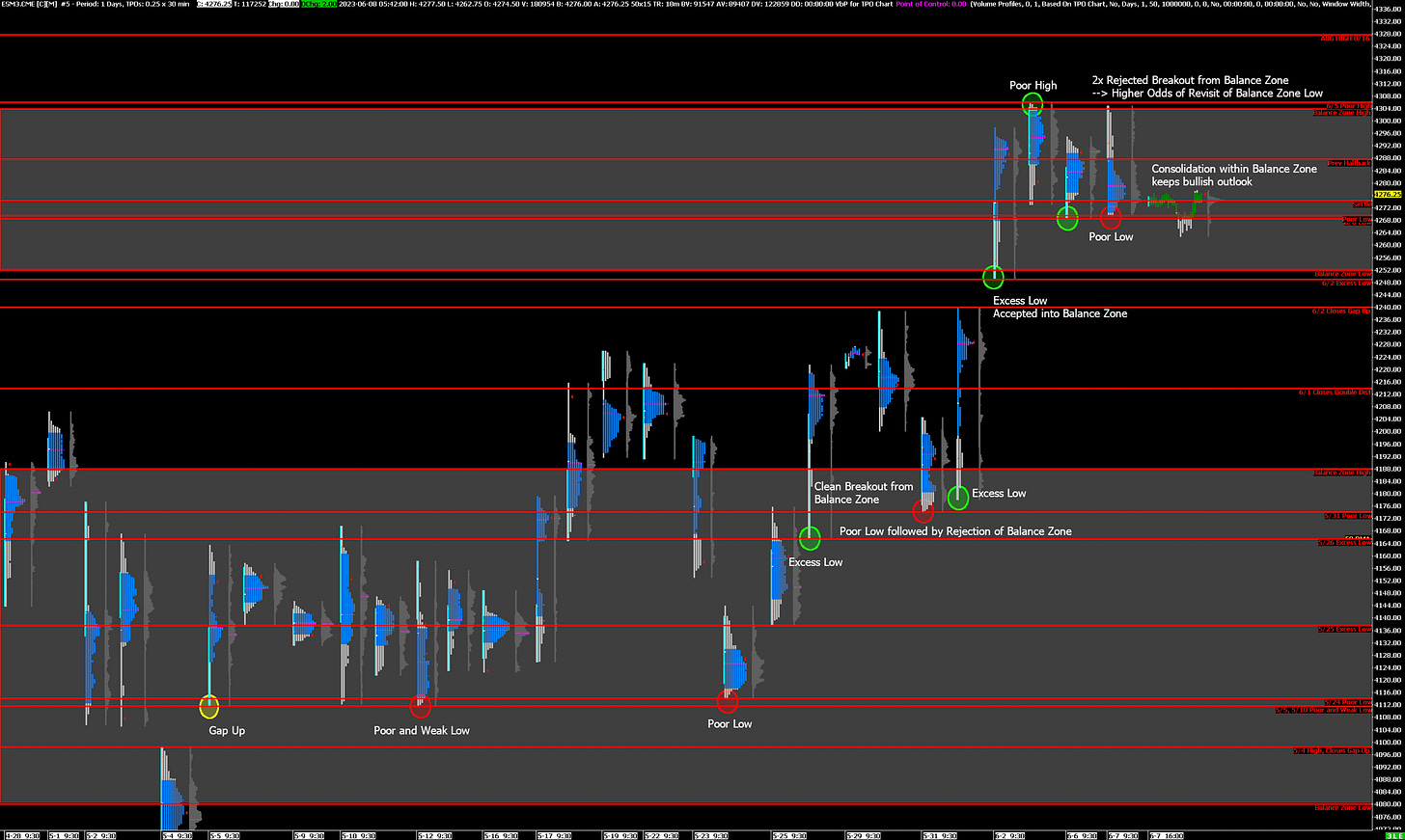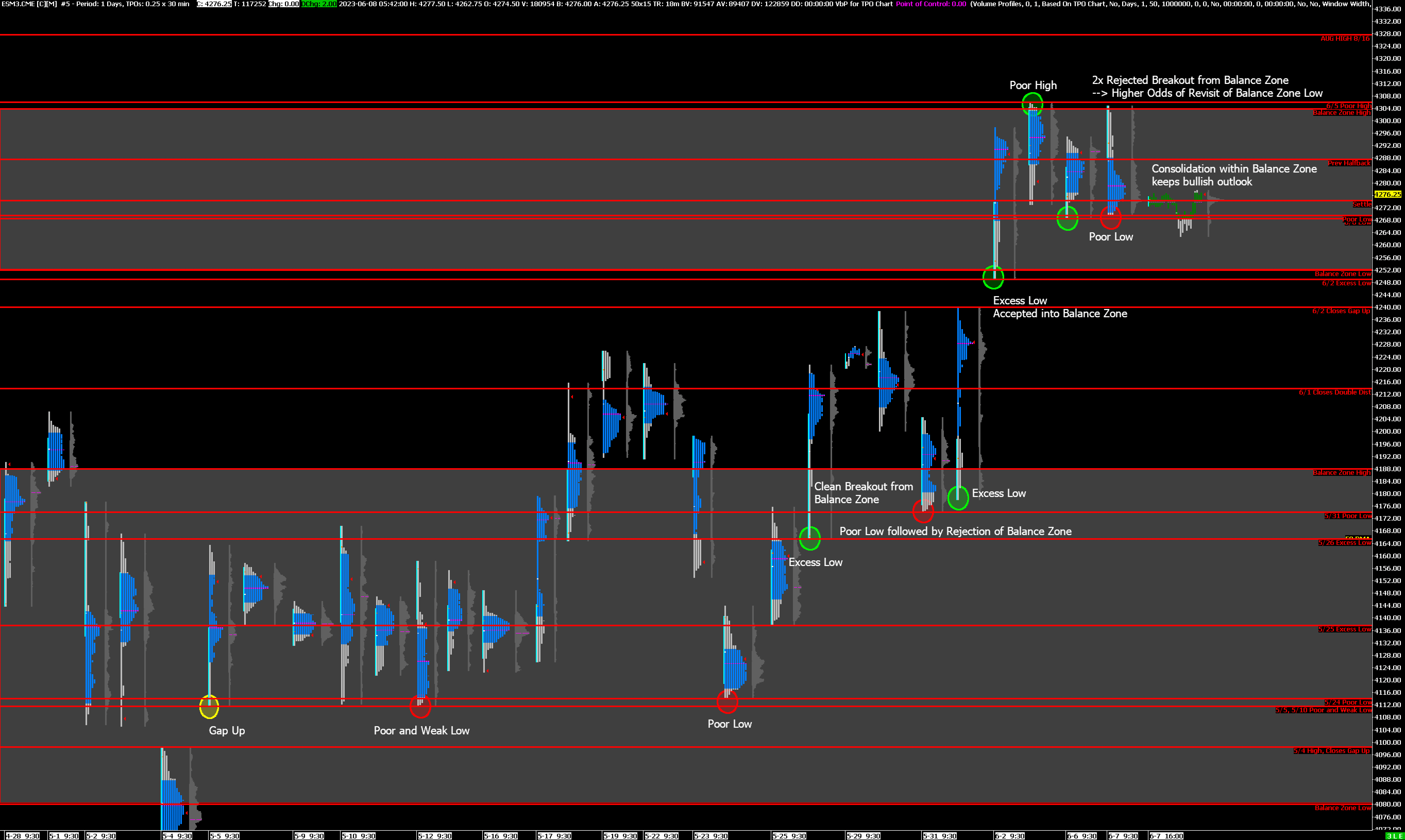 Bearish: 4269 (Poor Low), 4252 (Bottom of Current Balance Zone), 4240 (Closes Gap Up)