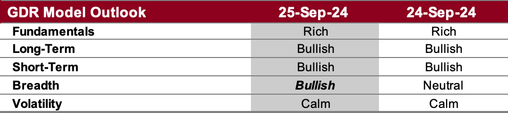 The GDR Model is taking a more defensive stance and carrying a reduced long position for now.