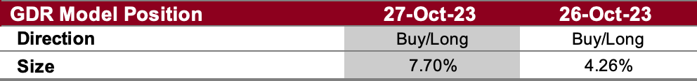 The GDR Model is flat after significant deterioration in the market. Sustained deterioration is likely to see the model open a short position.