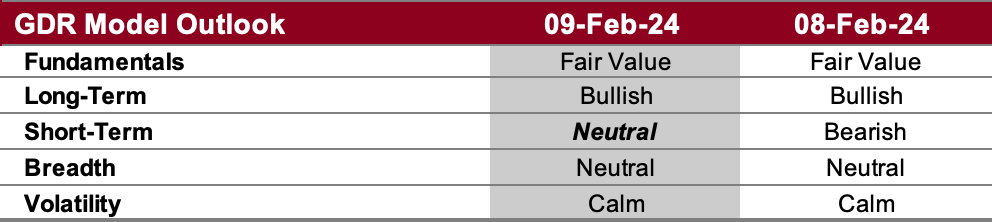 In line with the weakness the GDR Model picked up on recently, it has reduced its long position to roughly flat. Only if there is material strength will it re-enter a meaningful long position.
