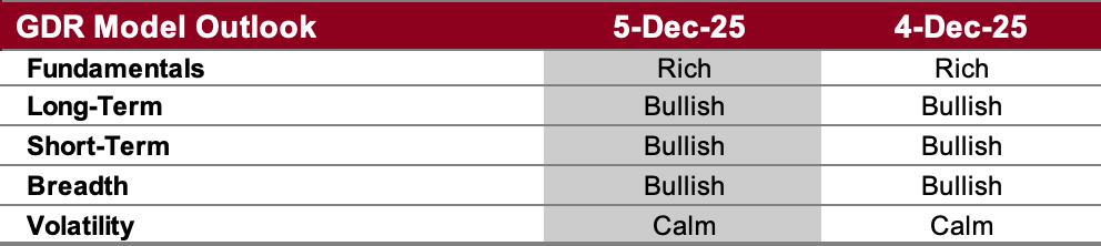Overall Outlook (as of 4 Dec 2025): BULLISH. The model is back to fully bullish, which means that, according to its framework, the odds of continued upside are relatively high. Let’s see if it sticks this time…